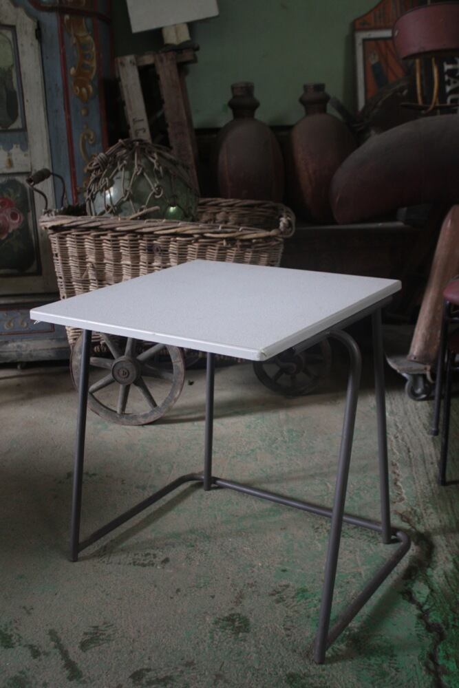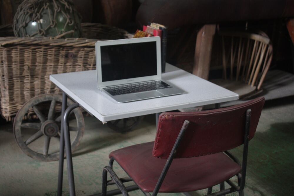 イギリス1980年代のデスクは、積み重ねが出来るよう、脚が広がっているデザインに。
