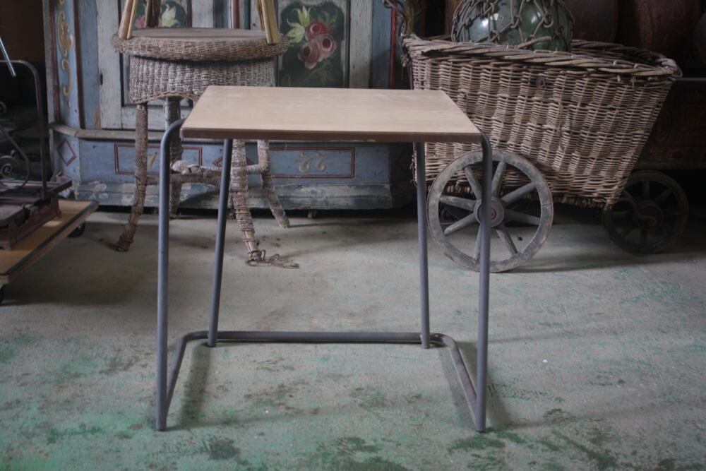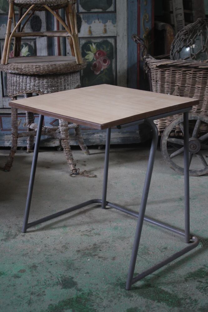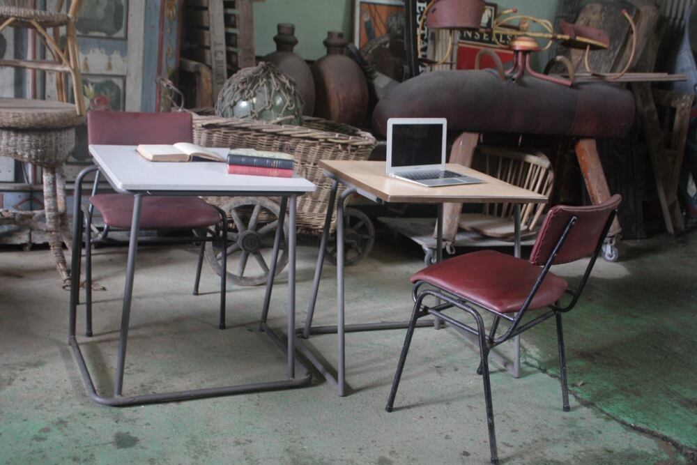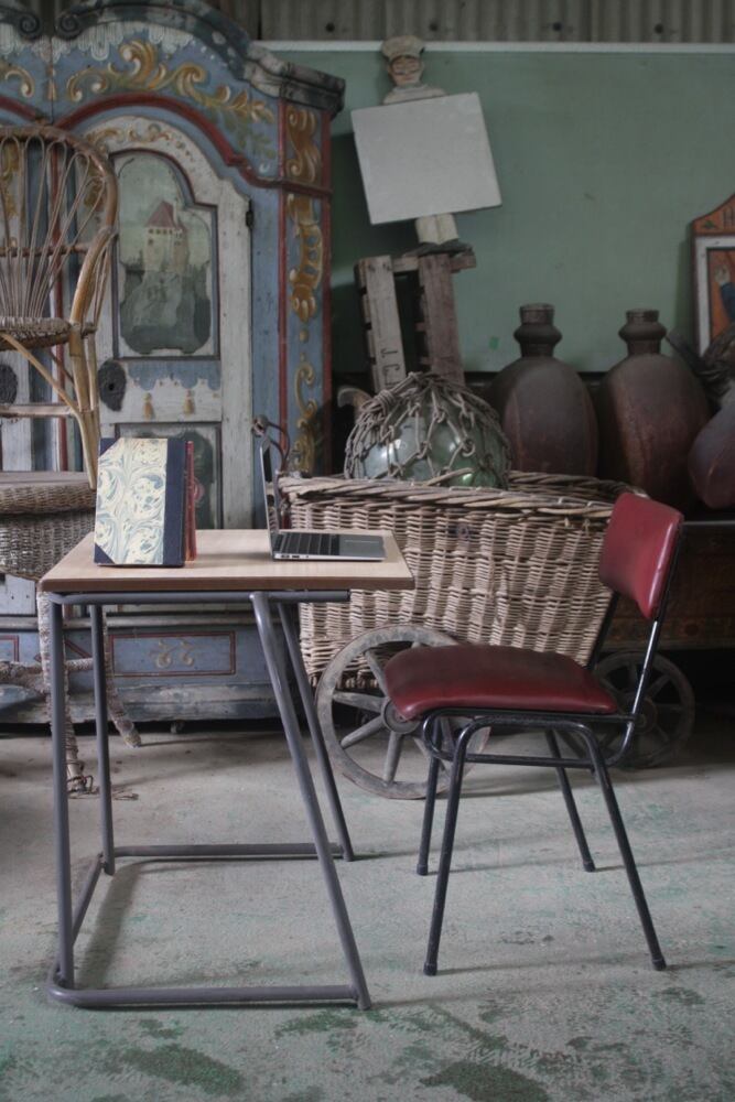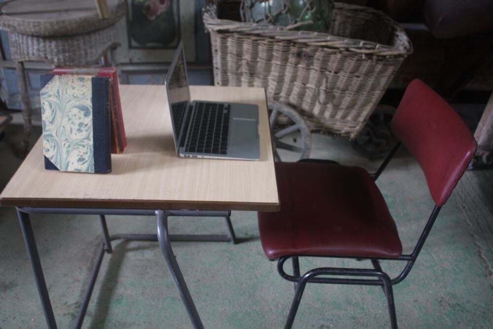 イギリス1980年代のデスクは、積み重ねが出来るよう、脚が広がっているデザインに。