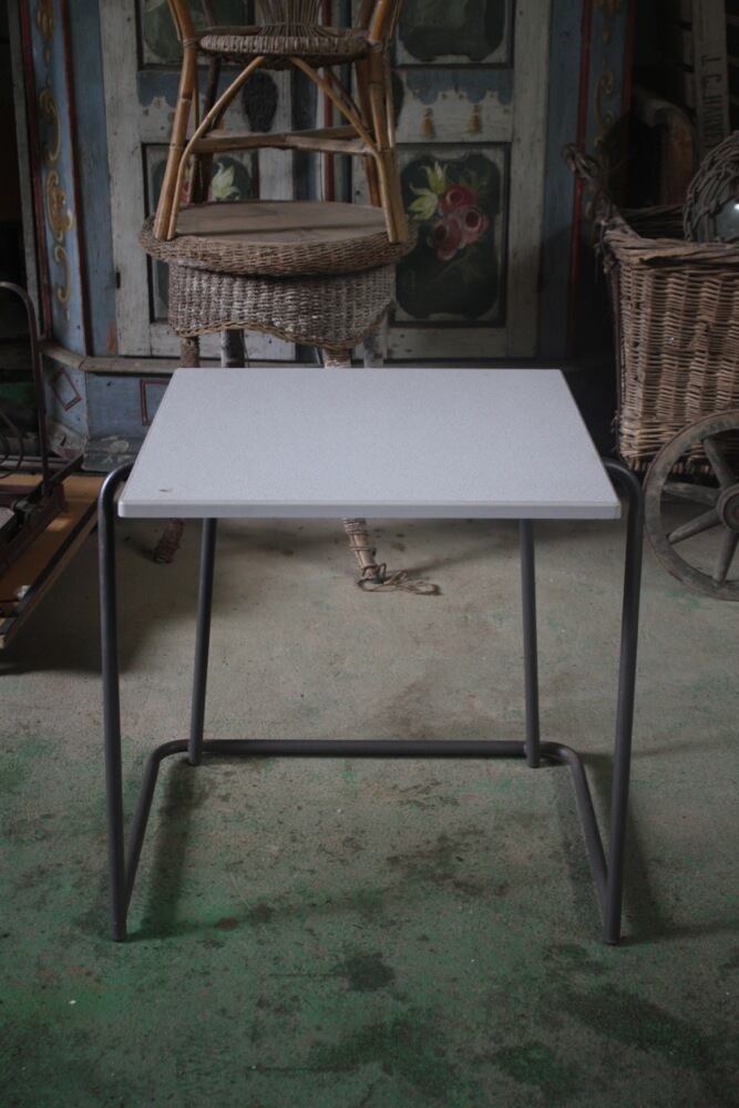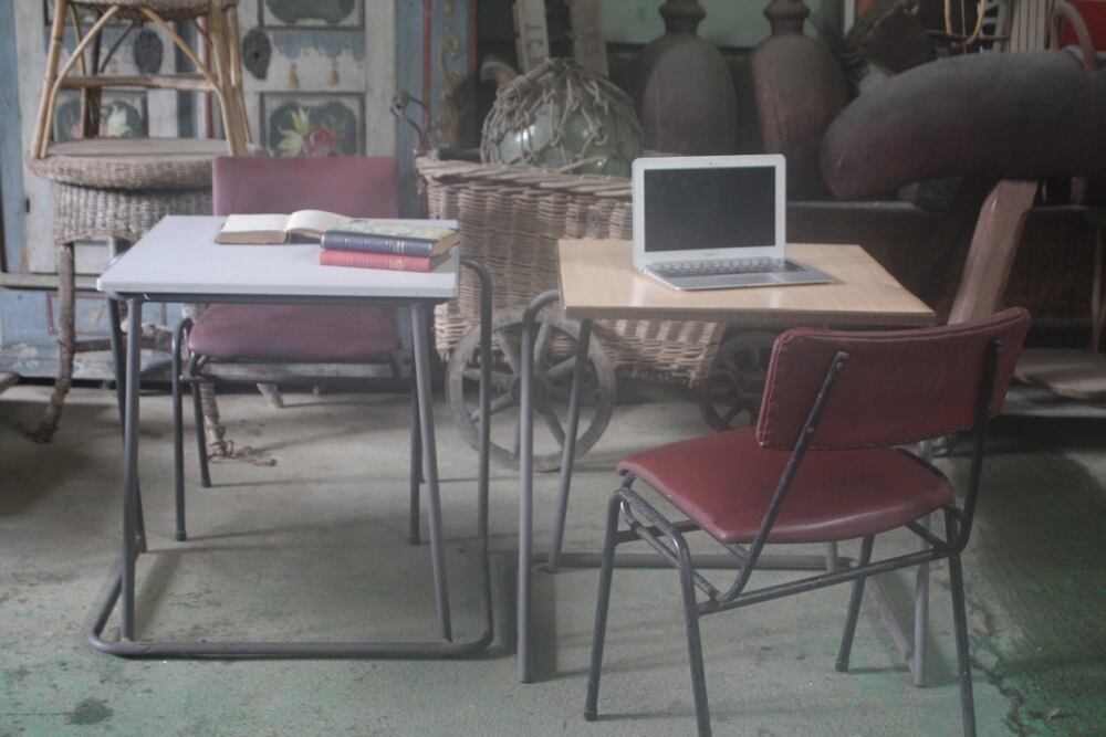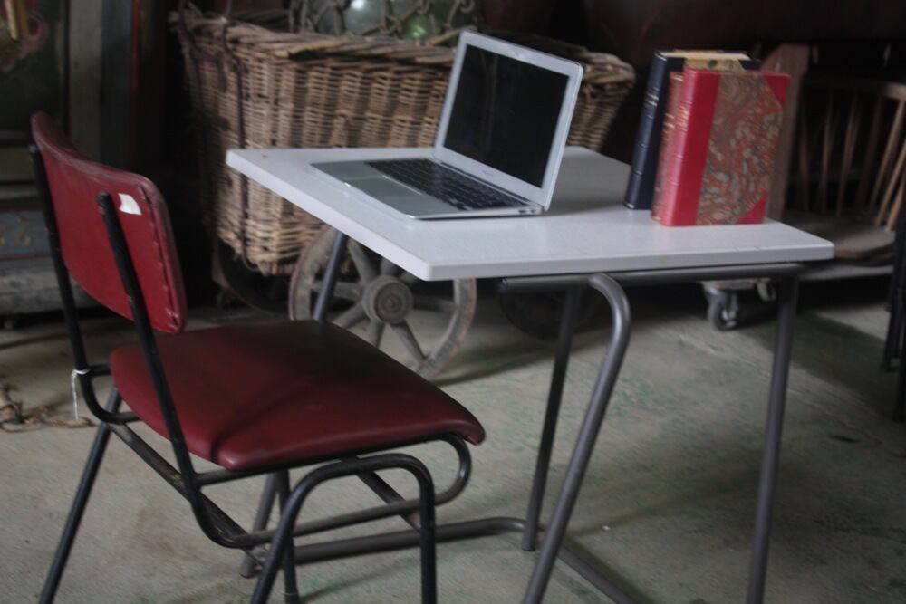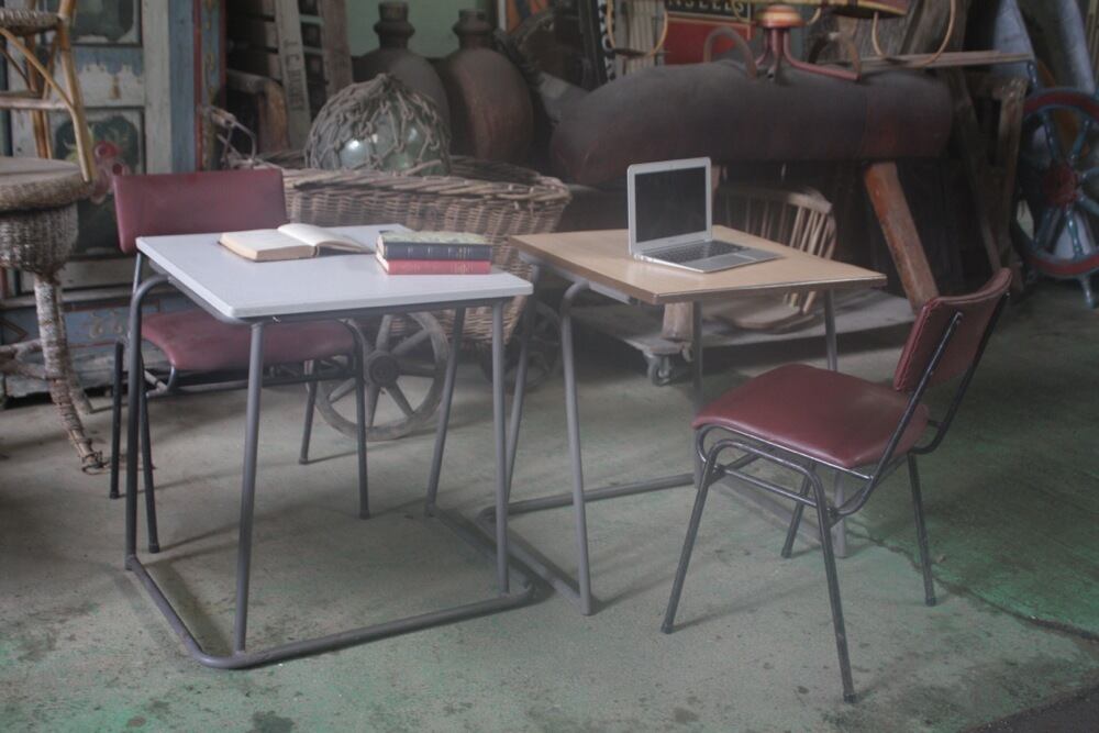 イギリス1980年代のデスクは、積み重ねが出来るよう、脚が広がっているデザインに。